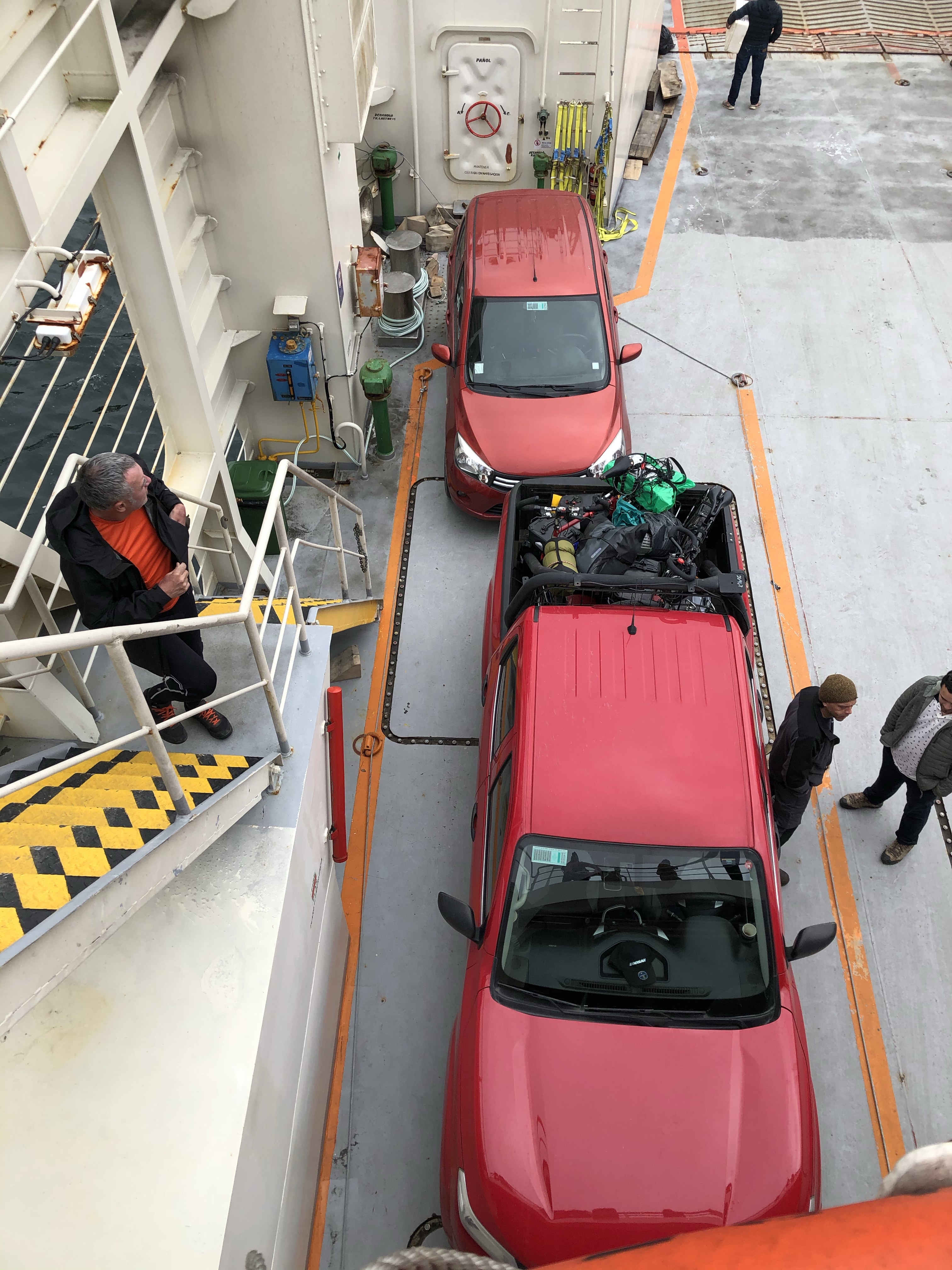 Les vélos sont chargés dans un pick up trouvé sur le ferry par la société de ferry. Après un petite angoisse pour comprendre le fonctionnement et se rassurer sur le transfert, le voyage se déroule sans problème. Il est même bien de ne pas rouler et de ne pas manger de poussière soulevé par les voitures sur le ripio sec sur la section en bus.