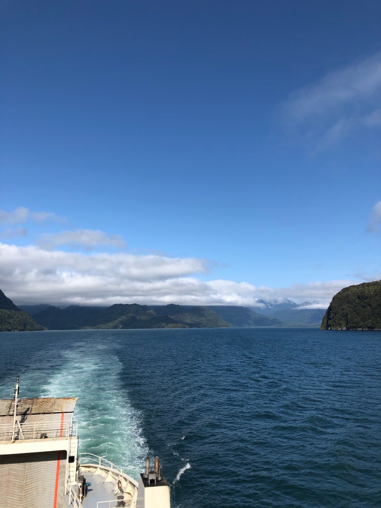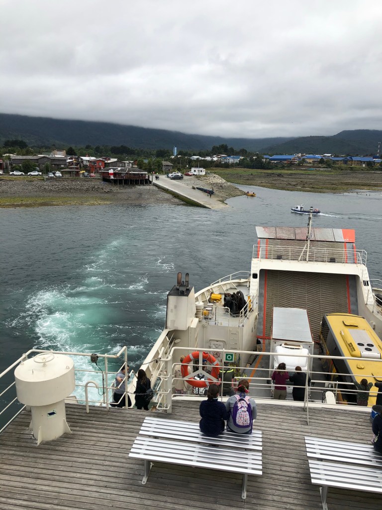Cela commence par une traversée en bateau décomposée en 3. Un bateau nous amène jusqu’à Leptepu. Puis un bus prend en charge les piétons et les cyclistes pour rejoindre un autre ferry et arriver à Caleta Gonzalo qui marque l’entrée du parc Pumalin.