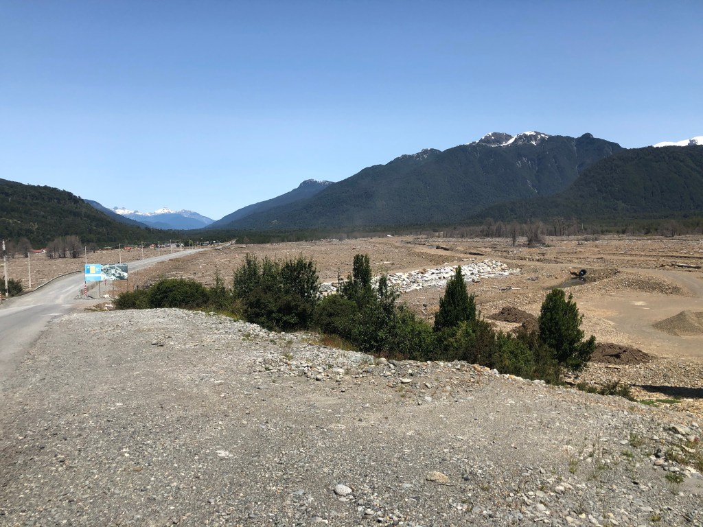 Mais le soleil passé 11h amène des taons arseleurs qui m’accompagneront dans la montée d’un col de 500m dénivelé. Ce col sera tellement raide que je serais obligé de pousser le vélo pour finir. La vallée d’après s’ouvre sur un gigantesque glissement de terrain qui a eu lieu l’année dernière tuant des habitants de sta Lucia représenter dans des drapeaux chiliens.