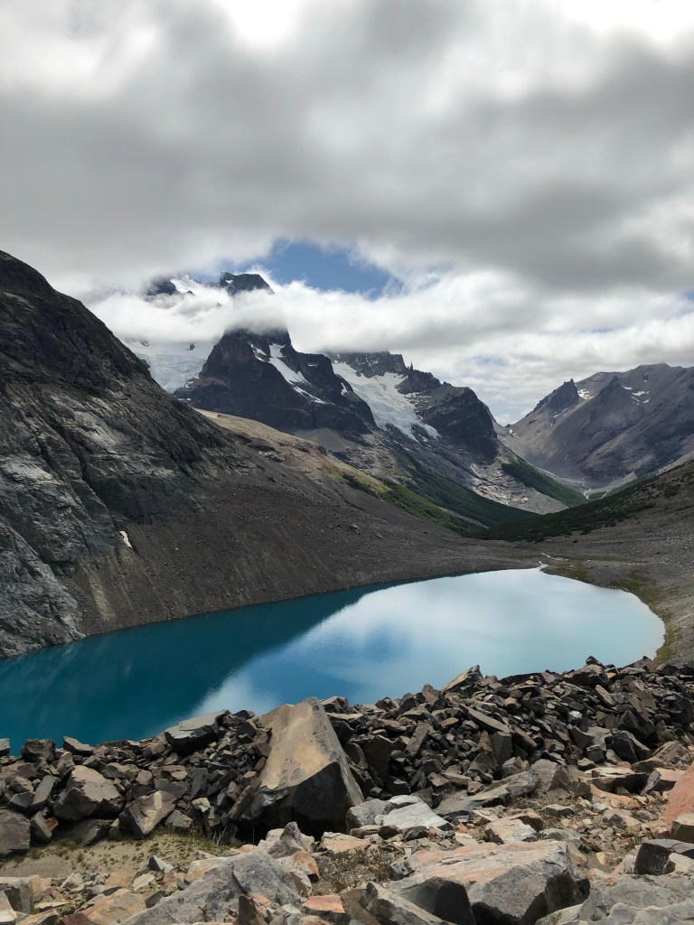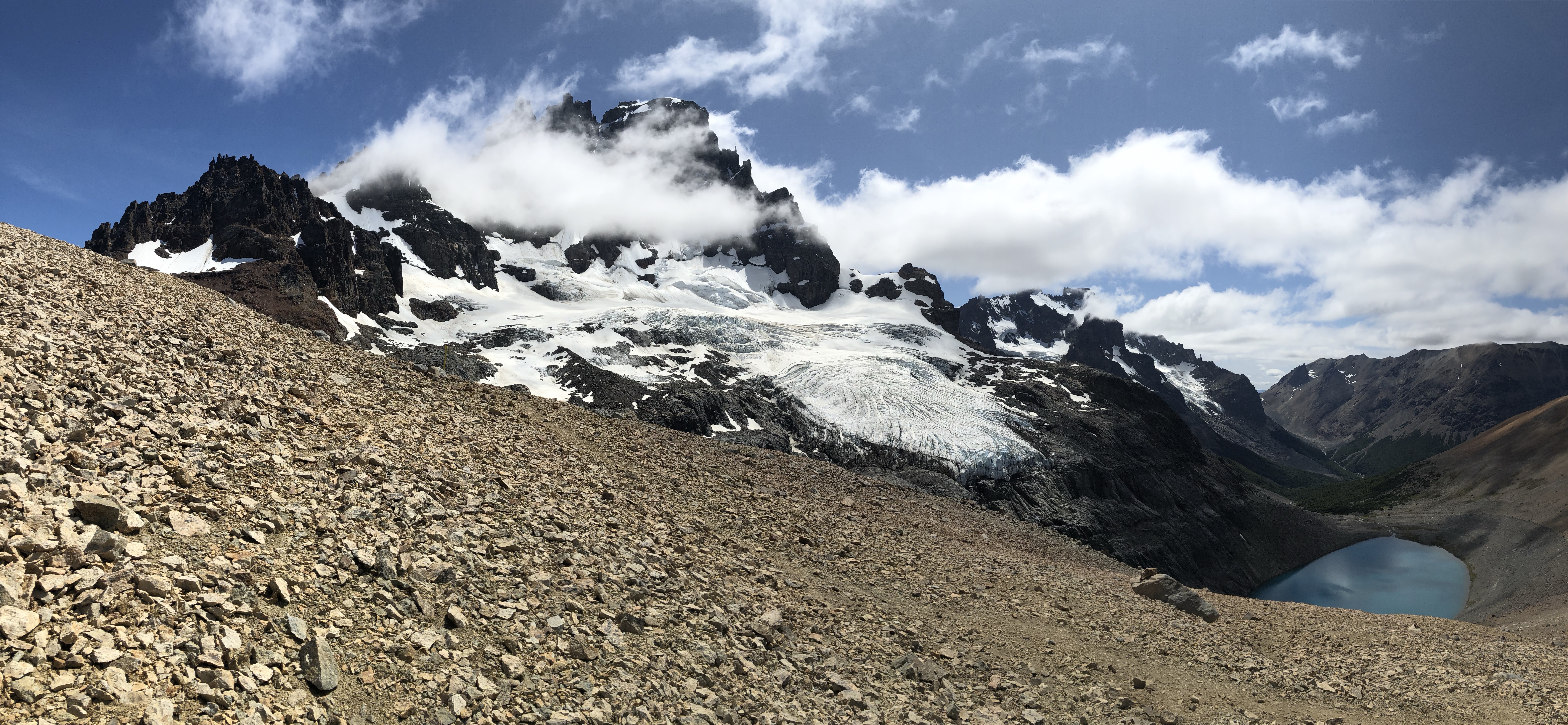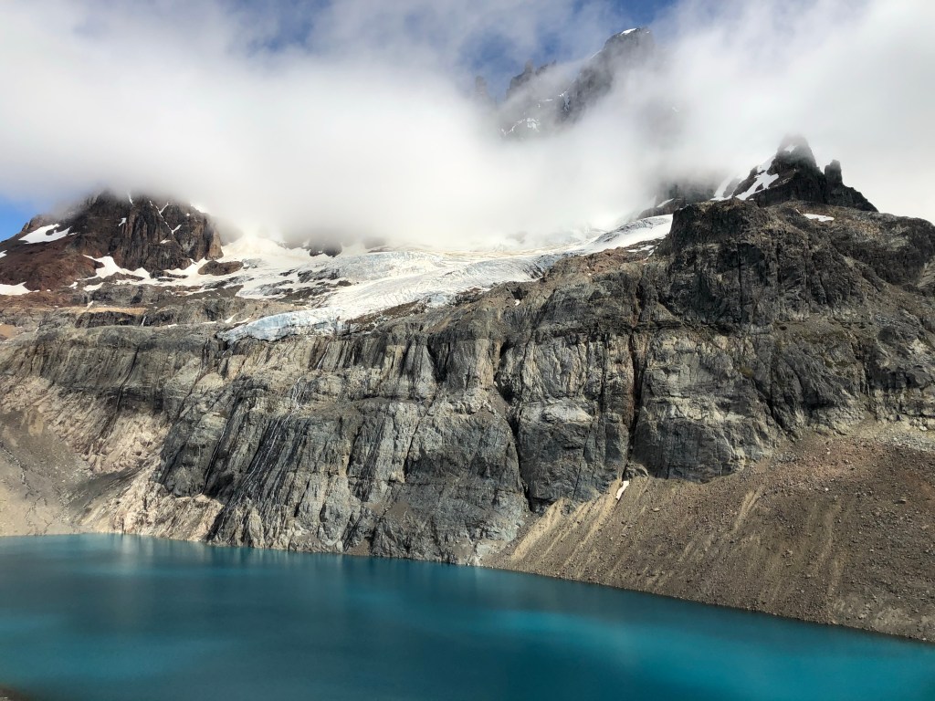 Pas forcément fatigué et après avoir posé la tente on continue en direction du lac Turbio. Le lac n’est pas vraiment beau alors qu’au dessus il semble que l’on puisse voir le glacier. Alors va pour un grimpette supplémentaire.