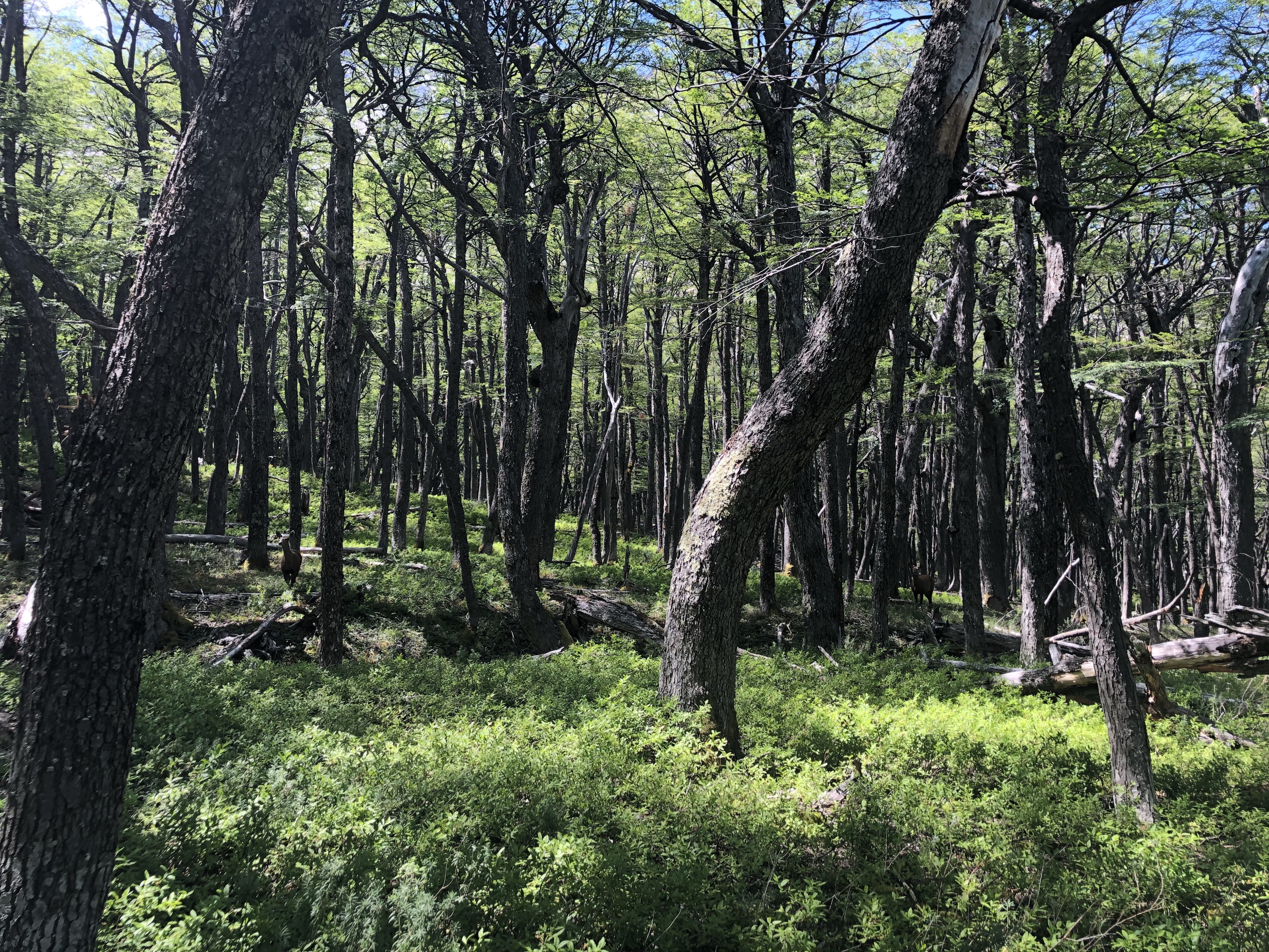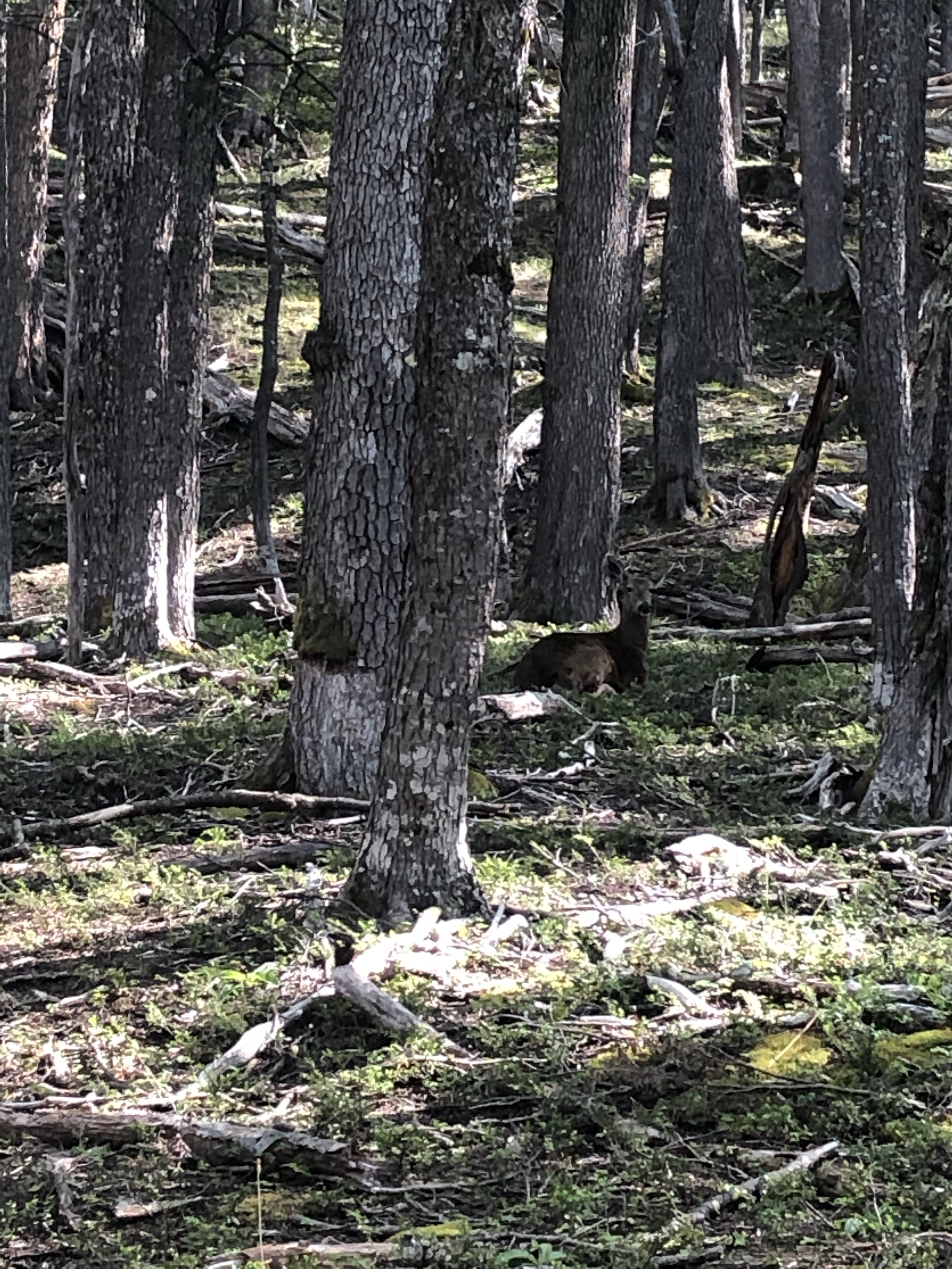 Le lendemain la carte, donné à l’entrée contre 2 conseils et 29 000 pesos, indique 2h de rando pour aller au lac Duff un peu plus haut. J’ai plutôt envie d’explorer un autre lac hors sentier. Je traverse une rivière qui me fait monter l’adrénaline en sautant de roche en roche et j’arrive dans un forêt où je vois un huelme, les petits cerfs locaux très rares.