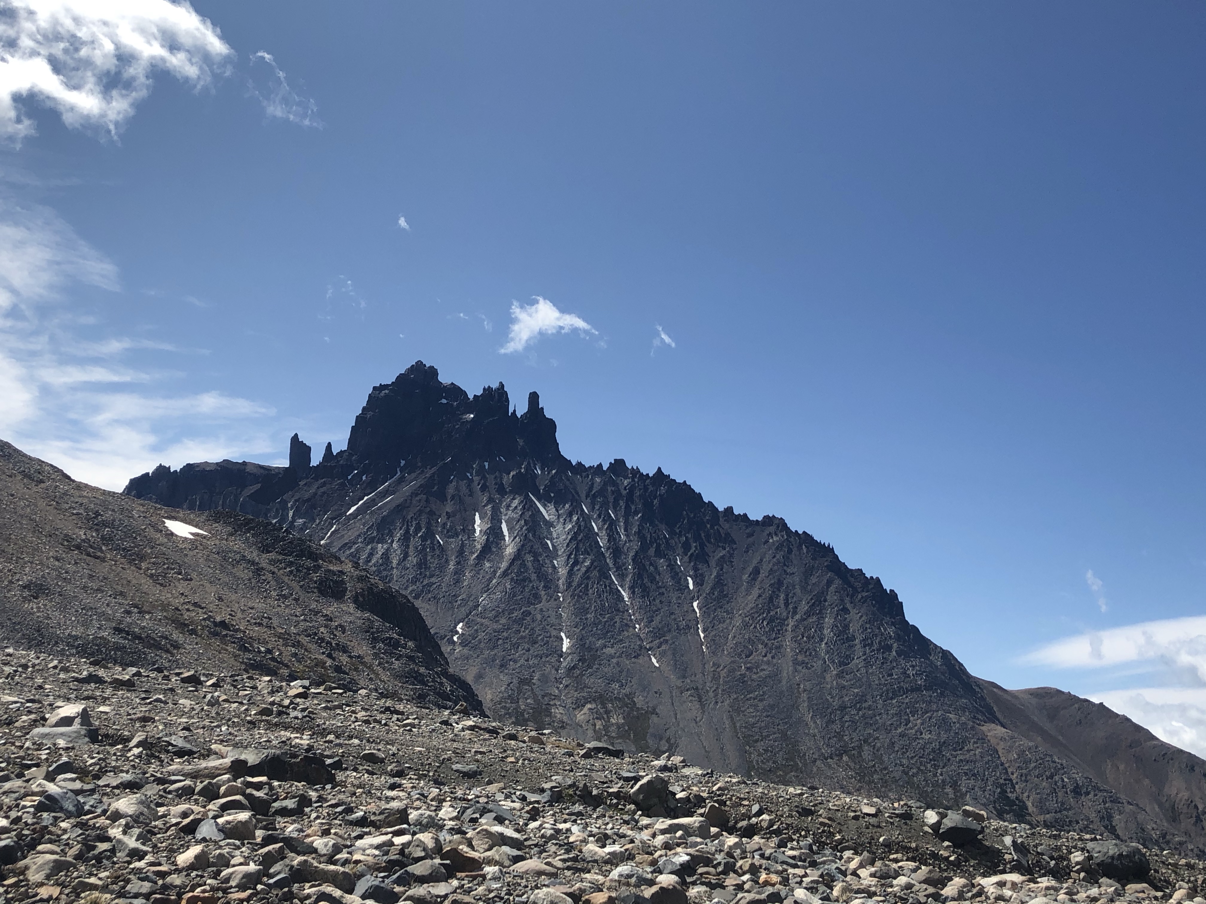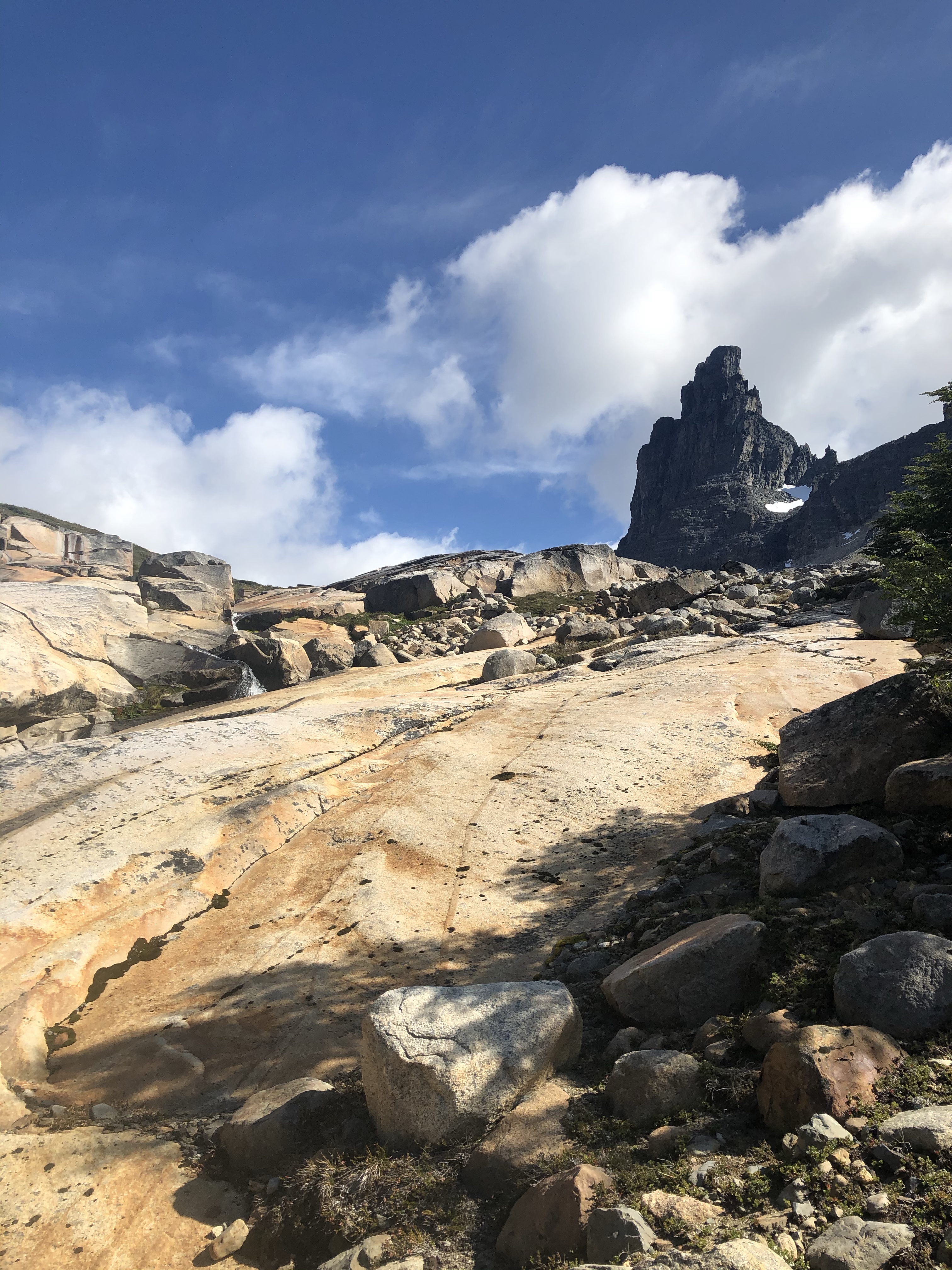Vers 13h, à l’heure où je mange, les nuages se déchirent et je peux voir cette belle montagne de 2600m, ce fameux Cerro Castillo.