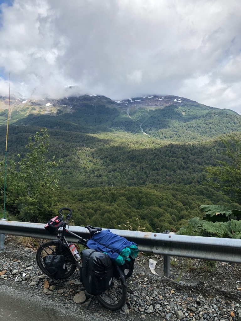 Parfois les surprises sont de voir un colibri à côté de la tente, de voir un pic vert creusant un trou dans l’arbre au dessus de moi, de croiser 2 gauchos à cheval sorties de nul part avec la peau de mouton sous la selle, ou de voir des dauphins chasser près de la côte et surprendre leurs elerons, la surprise du jour s’est consisté d’un ripio vraiment pas cool et profond. Après avoir bataillé pendant 2h pour faire 15km je suis enfin arrivé à la partie sud du parc Queulat.