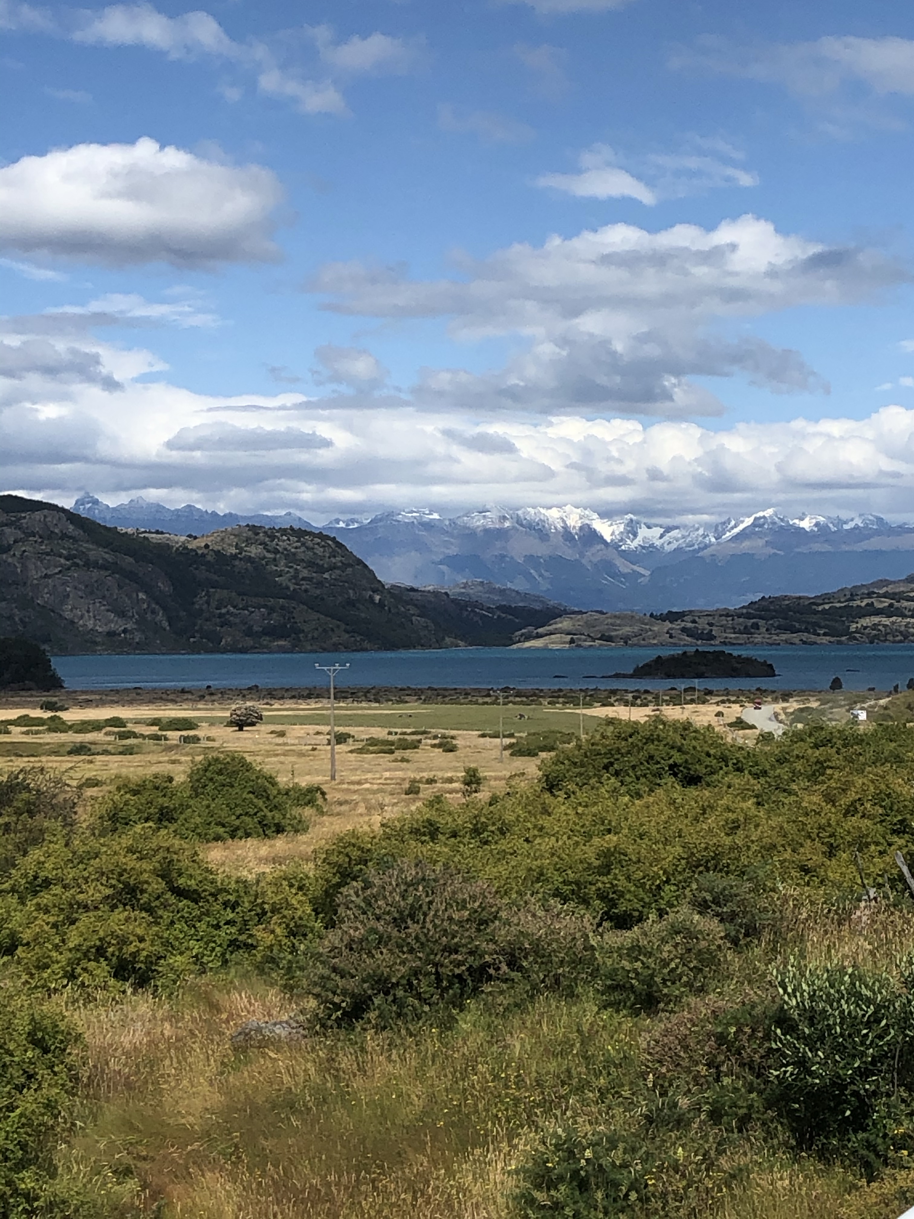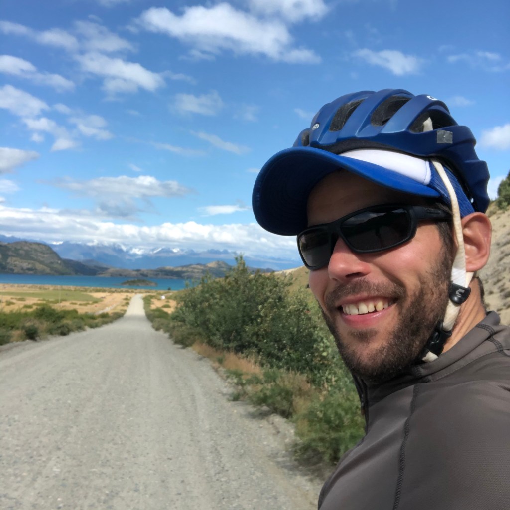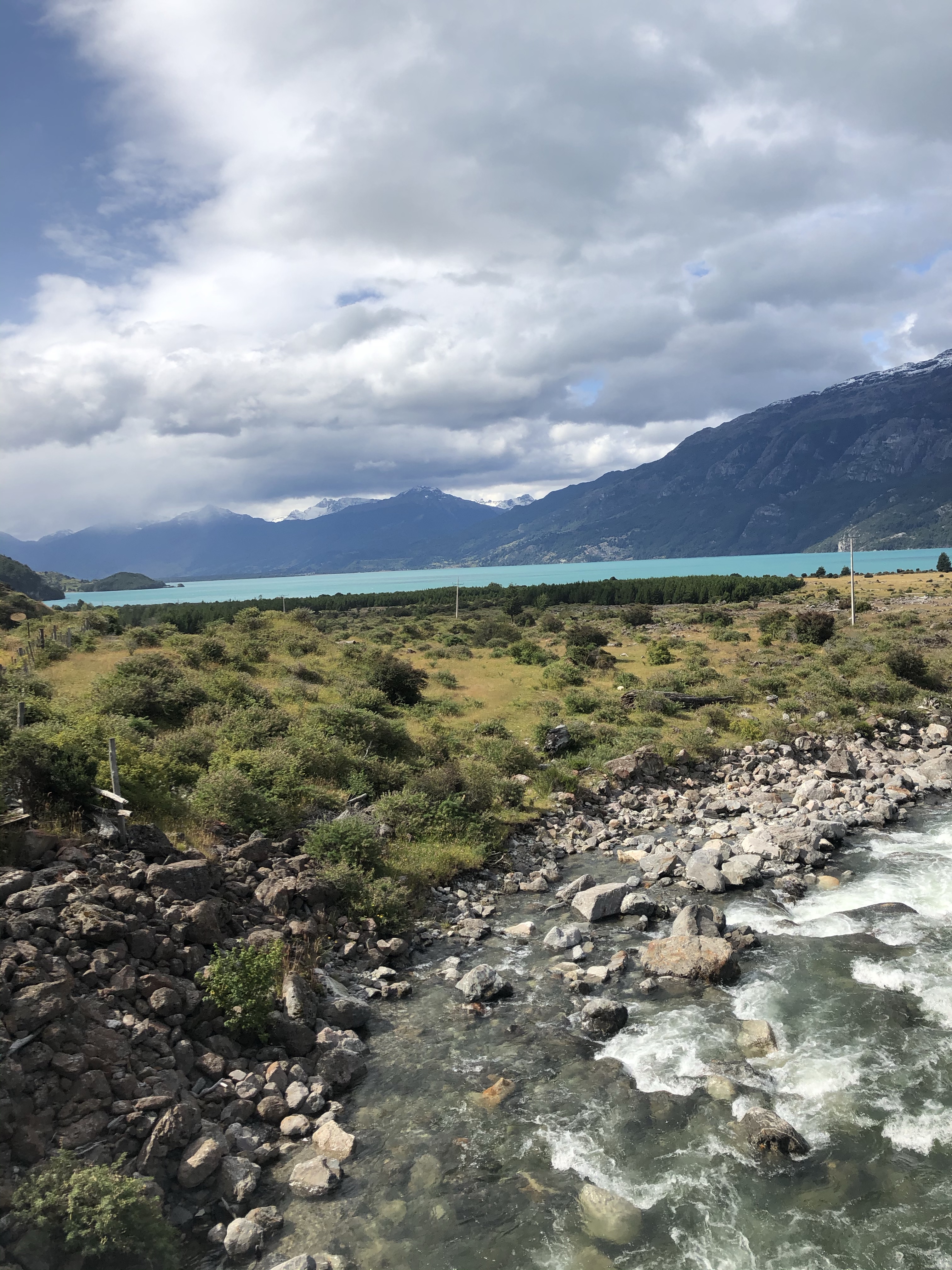 En route je recroise le couple de français avec leurs enfants. On fait une partie du chemin jusqu’à ce qu’ils me signalent que mon vélo fait un drôle de bruit. Il s’avère que j’ai mal remplacé la chaîne à coyhaique et que je ne l’ai pas fait passer au bon endroit. Étonnement ça ne me prendra pas longtemps à faire cette opération sans attache rapide. D’habitude j’en ai bien pour une demi heure, ici 5 min! Je repars en rattrapant les français au lac général carrera, le lac géant couleur émeraude à cheval entre le chili et l’argentine.