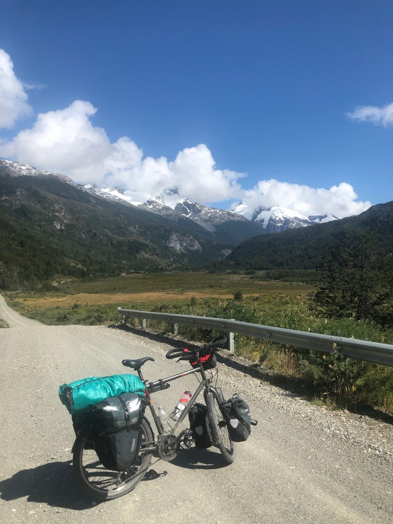 Puis le plus haut col de la carretera austral arrive avec des grosses montées. Après 63 km sur la journée j’arrive vers 16h30 dans un camping conaf car on est dans le parc national de Cerro castillo. Je viens de faire une partie de la route faite en bus 🙂 .
