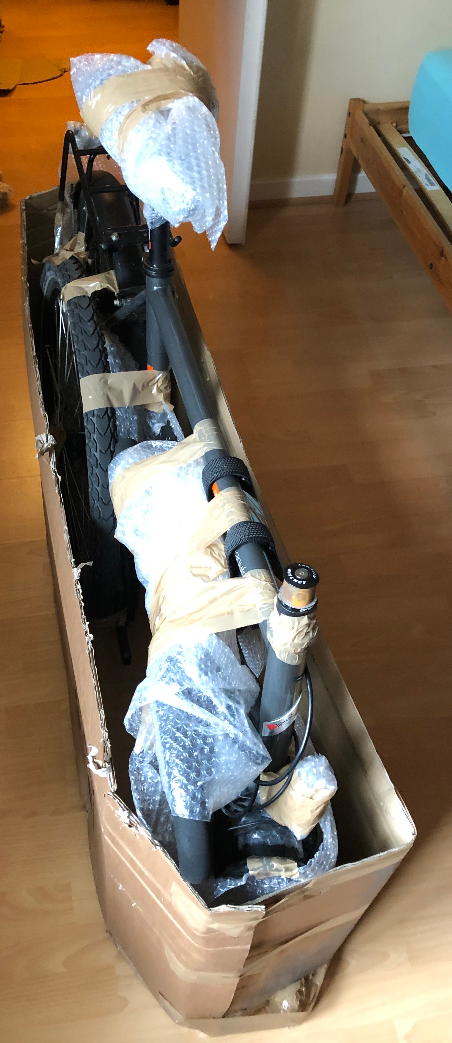 et ci dessous une idée du casse tête pour diminuer la taille du vélo. Les compagnies aériennes sont marrantes, elles ont toutes des politiques de transports différentes. Une accepte 300cm linéaire de carton mais d’autres (dont celle que je vais prendre au 1er vol) acceptent des dimensions plus petites comme 131+72+21 cm. Ca fait la différence. On verra comment ca se finit!